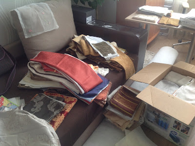 Остатки от рукоделия - меняемся, продаем ", появилось объявление одной очень уважаемой владелицы салона штор, с предложением забрать как можно быстрее БЕСПЛАТНО образцы тканей, остатки от кроя. Салон штор, в связи с переездом избавлялся от ненужного. Вы можете представить мое состояние. Объявление свеженькое, никем не читанное. Я давай писать ей в личку, что вот она я, готова забрать все хоть сию минуту! Дело в том, что в салоне у нее я была в поисках ткани для своих шедевров в спальню, ткани у нее ну очень красивые и где-то даже ее телефончик у меня имеется. Не дожидаясь ответа в форуме, и из-за боязни , что кто-нибудь другой перехватит все это богатство, я набралась смелости и позвонила ей. Договорилась о встрече и на следующий день я была у них. Меня ждали три огромных мешка, набитых разными тканюшками, и несколько коробок. Понятное дело, что разбирать там на месте, что мне нужно,а что нет не было ( а нужно мне было все), в общем моя машинка ниссан -микра была завалена полностью.И багажник, и пассажирские сиденья сзади и спереди .А мой внутренний хомяк и жаба просто отплясывали "Макарену"! Жаль, что я не сфотографировала все это. Сколько было счастья в этот момент!!! Отблагодарив приличной коробкой конфет , я уехала домой. Интрига сжигала меня из нутри. Что там внутри...Пока ехала, вытаскивала на светофорах одной рукой образцы, из рядом лежащих кульков.А там все не было видно конца и края...Блаженство.