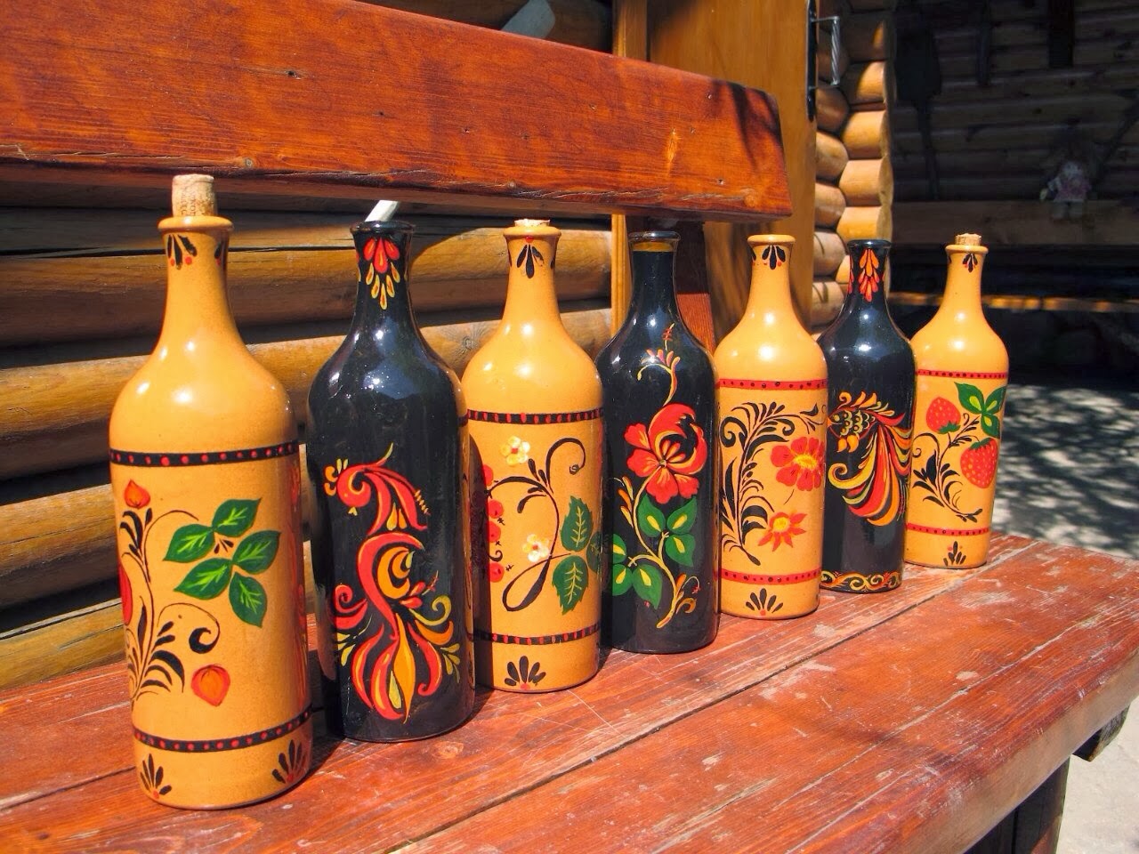 Проба пера,т.е. кисточки. Расписала бутылки из под грузинского вина под хохлому. Да пусть не обижаются грузинские виноделы и мастера хохломской росписи за такой микс.