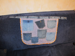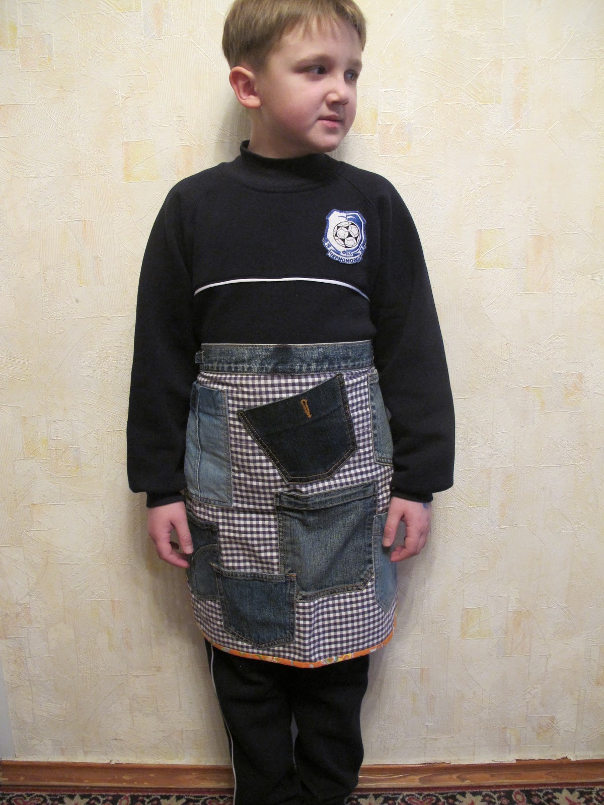 Джинс не дает мне покоя. Вернее то, что от джинс остается. В этот раз в ход пошли карманы и пояс. Дело в том,что мне на работе нужно много разных предметов держать при себе,перемещаясь в помещении. Теряя много времени на поиски нужного, возникла мысль распихать все по карманам - поэтому карманов на фартуке много. Такой себе переносной органайзер. Демонстрирует мой младший сын.